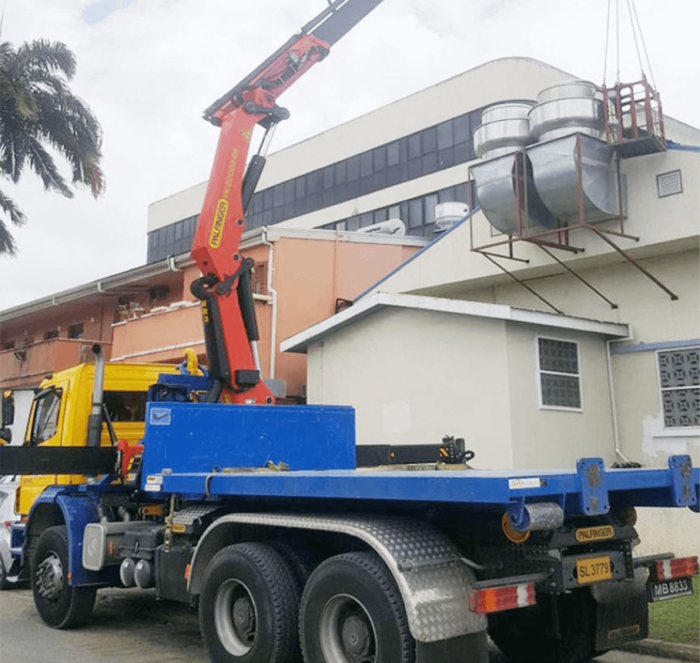 <strong>5.8 Metric ton Or 6.5 US ton Knuckle Boom truck</strong> 6.5 US Ton knuckle boom crane mounted on Tractor Unit. This machine has 41’ main boom and 34’ of hydraulic luffing jib. This machine also has the ability to transport cargo in multiple configurations. It can be fitted with a tray for items up to 14’ in length and 8’ in height and width, for items going in confined areas. The crane can be fitted behind the cab or to the rear of the truck. This machine has the ability to be a transport only unit with a tray length of 20’. <strong>T15 Hook loader</strong> The T15 Hookloader allows us to use the truck as a crane and transport device. We can place the tray directly onto the ground to load equipment in roll on, roll off capacity. We can also handle garbage skips and operate the vehicle as a typical dump truck. Having a single truck operating in a multi-role keeps the vehicle busy and fully utilizes the truck and the operator.
